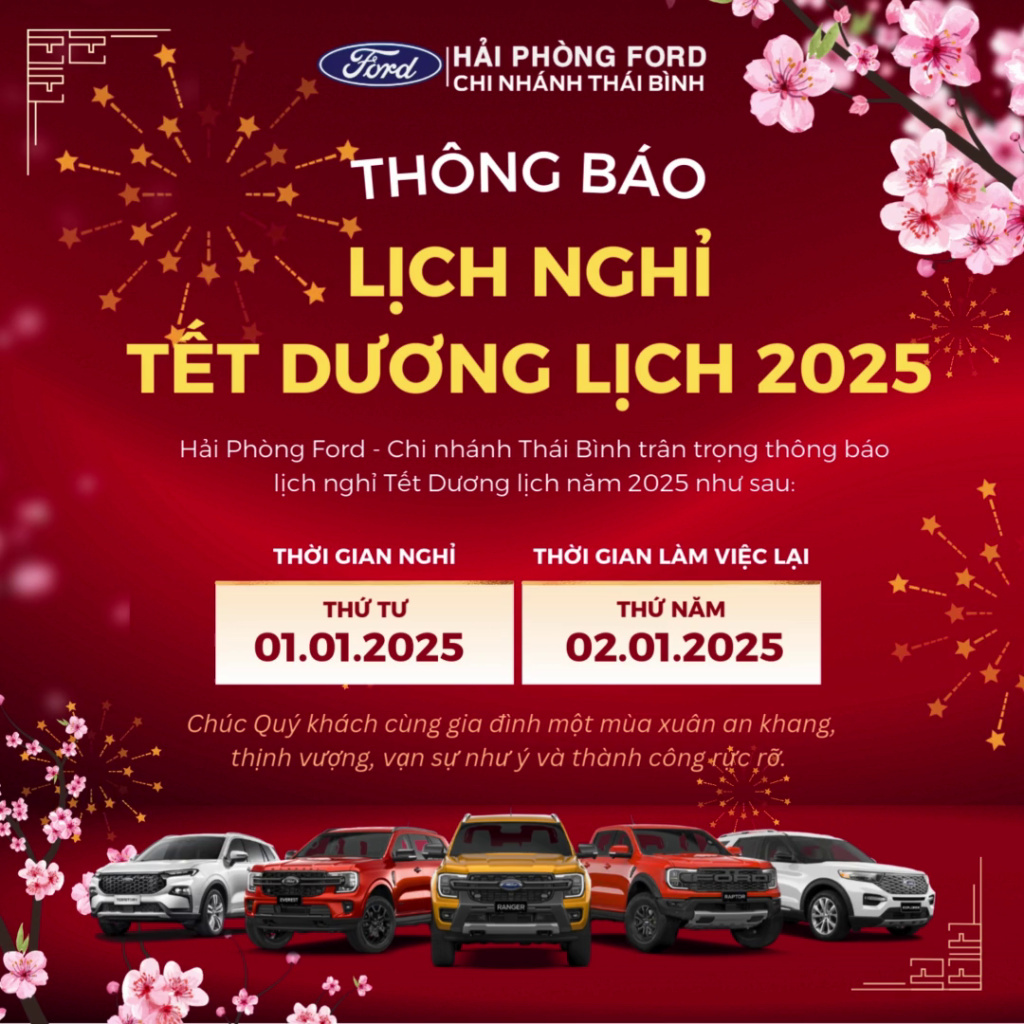 Hải Phòng Ford - Chi nhánh Thái Bình xin trân trọng thông báo đến Quý khách hàng thời gian nghỉ Tết Dương lịch 2025 như sau:
